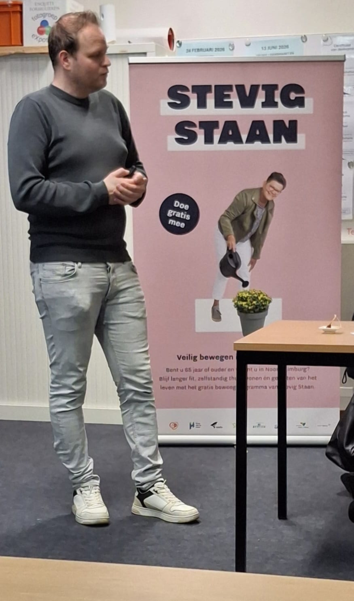 Dit gebeurt door het aanpakken van de risicofactoren. Balansverbeteringsefeningen en bijvoorbeeld het aanpassen van de woning om struikelen te voorkomen en het letten op medicijngebruik en voeding, dragen hiertoe bij. Verschillende onderwerpen kwamen tijdens deze bijeenkomst aan bod, zoals bewegen en gezondheid, voeding, medicatie en ergotherapie. Vooral veel bewegen is bij ouderen van groot belang om zodoende stevig te staan en vallen te voorkomen. Het houdt de spiersterkte op peil en is natuurlijk ook van belang voor de algehele conditie bij deze groep.