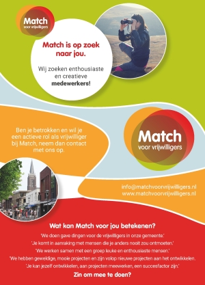 Match voor vrijwilligers is volop in ontwikkeling. Om alle plannen goed vorm te geven heeft de organisatie nieuwe – vrijwillige – bestuursleden en medewerkers nodig. Wij zoeken enthousiaste en creatieve mensen, zin om mee te doen?